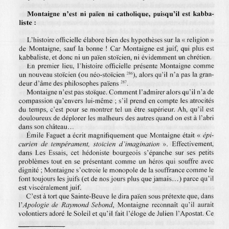 La Boétie est le grand ami de Montaigne, que j’ai appelé l’« Érasme juif », parce qu’il est marrane. Montaigne sert d’intermédiaire entre Érasme et Descartes et ses Essais reprennent tous les poncifs Humanistes qui sont devenus les erreurs de la philosophie moderne, erreurs exploitées de nos jours par le mondialisme. Individualisme, relativisme religieux, culte républicain, etc.