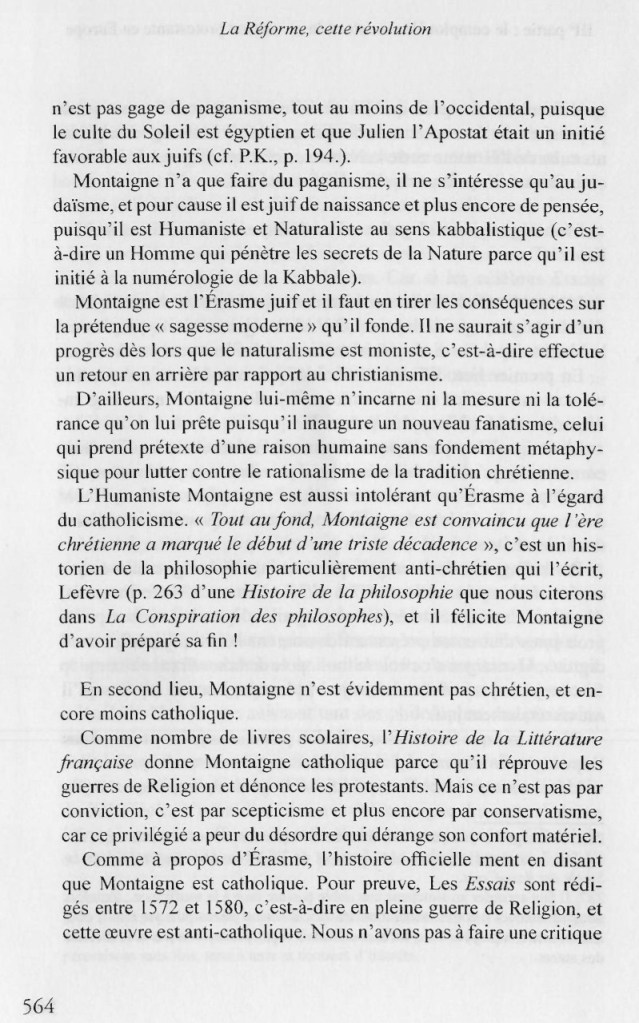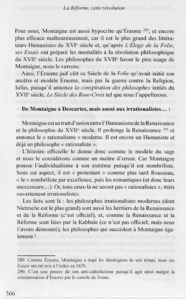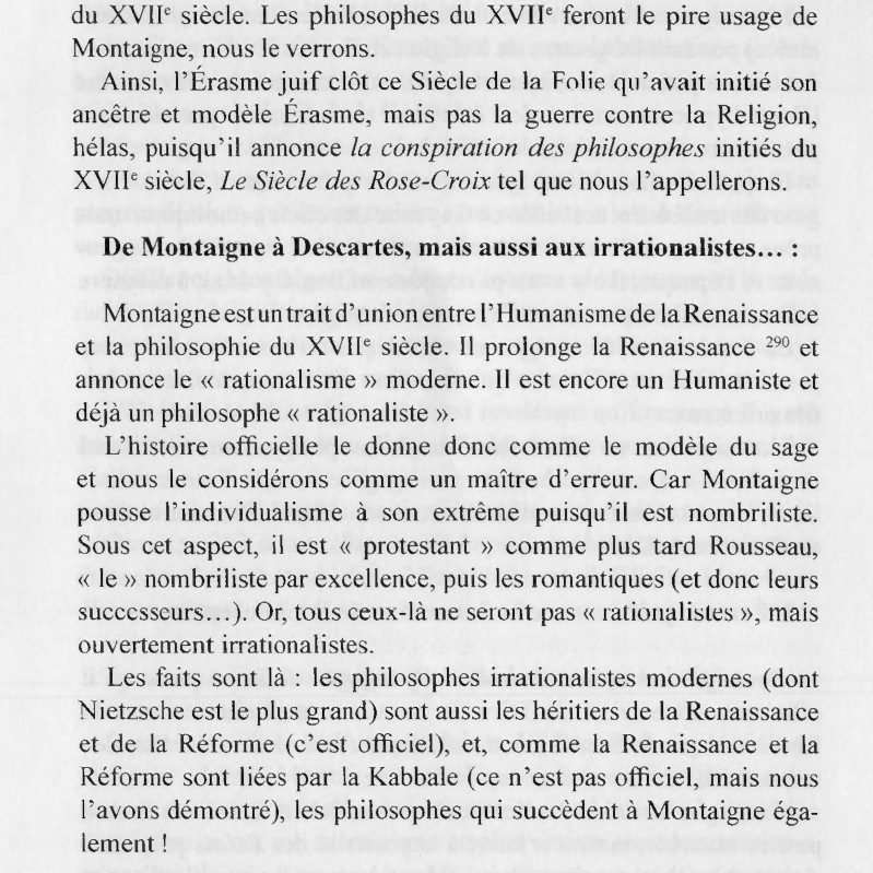 Autre fait, La Boétie et Montaigne sont des ennemis du catholicisme, donc complices des protestants qui ravagent la France. Ils sont les « amis » au sens initiatique de Michel de l’Hospital, présenté lui aussi comme « tolérant » alors qu’il est anti-catholique. À l’époque, la France est catholique et le discours de La Boétie est publié par des protestants sous le titre Contr’Un, ce qui vise le roi. Montaigne écrit ses Essais anti-catholiques – le « que sais-je ? » met en cause le dogme – pendant les guerres de Religion, qui sont menées en France par les disciples de Calvin, Humaniste et protestant qui est probablement aussi marrane. Plus tard, le combat calviniste sera repris par Rousseau, qui est avec Voltaire l’un des pires philosophes des Ténèbres. L’un prétend au cœur, l’autre à la raison, les deux appellent à la haine anti-catholique. Quel que soit leur talent littéraire, La Boétie, attention danger, quant à Montaigne, Rousseau et Voltaire, leur place est à la poubelle de l’histoire !