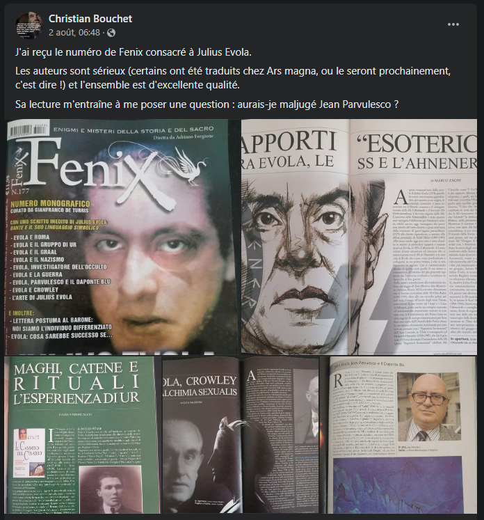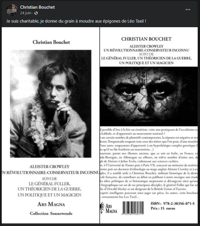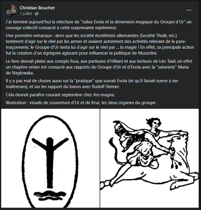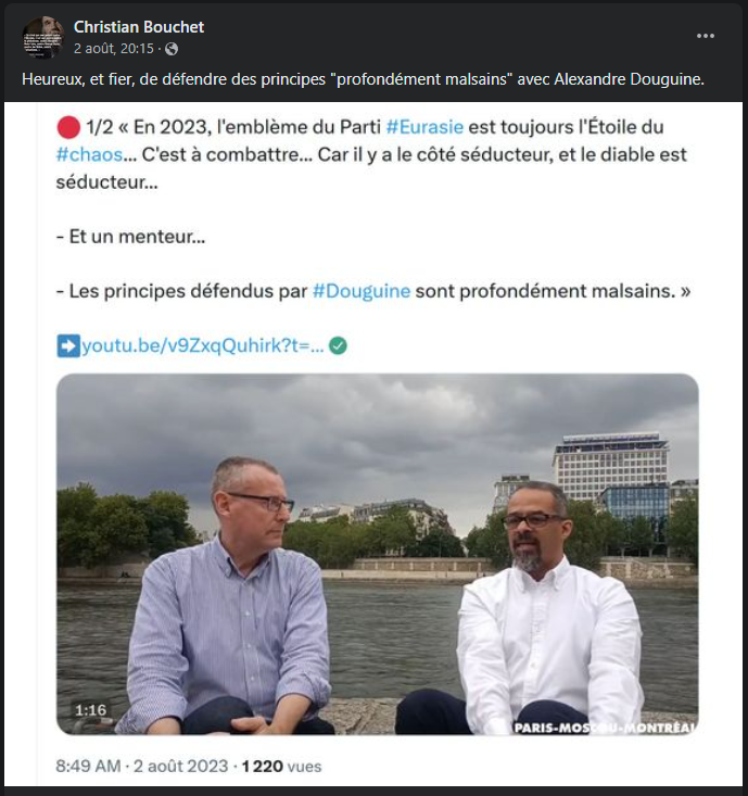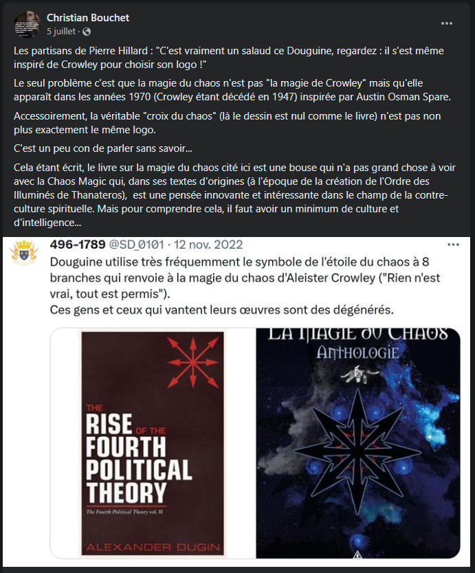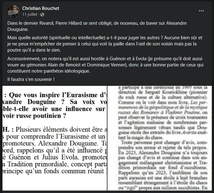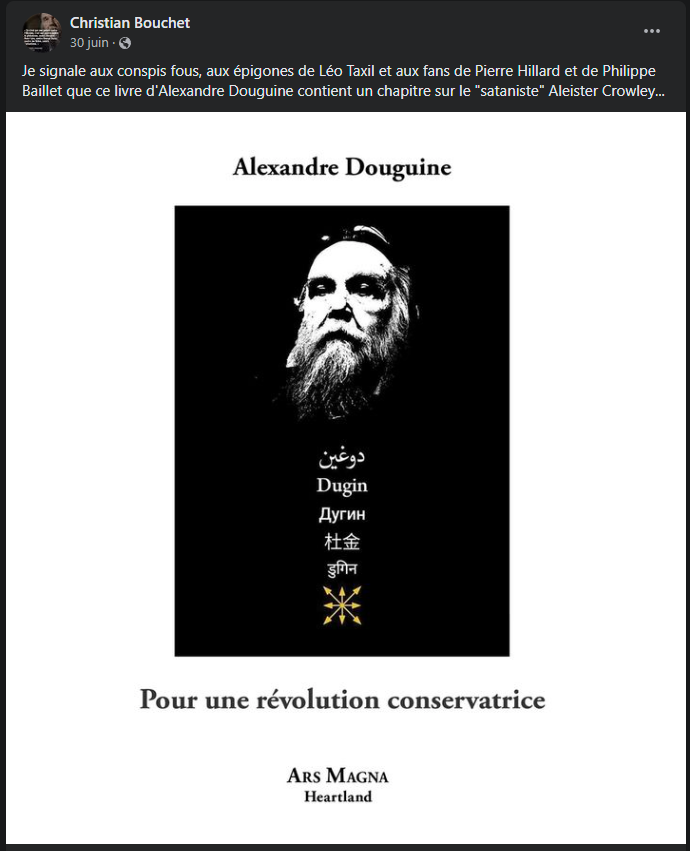 Christian Bouchet, à l'instar de son ami Alexandre Douguine dont il est l'éditeur et le représentant en France depuis trente ans, évolue depuis sa jeunesse dans l'occultisme et incarne cette doctrine révolutionnaire et apparemment nationale de manière totalement décomplexée.