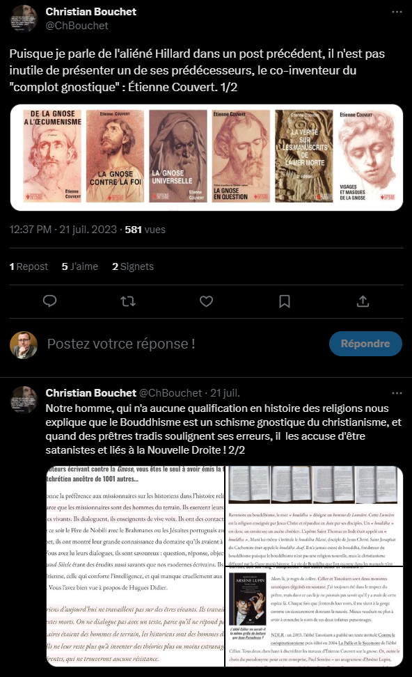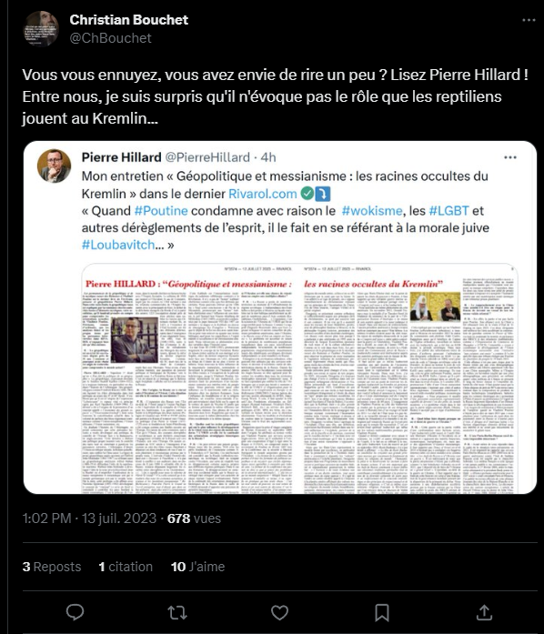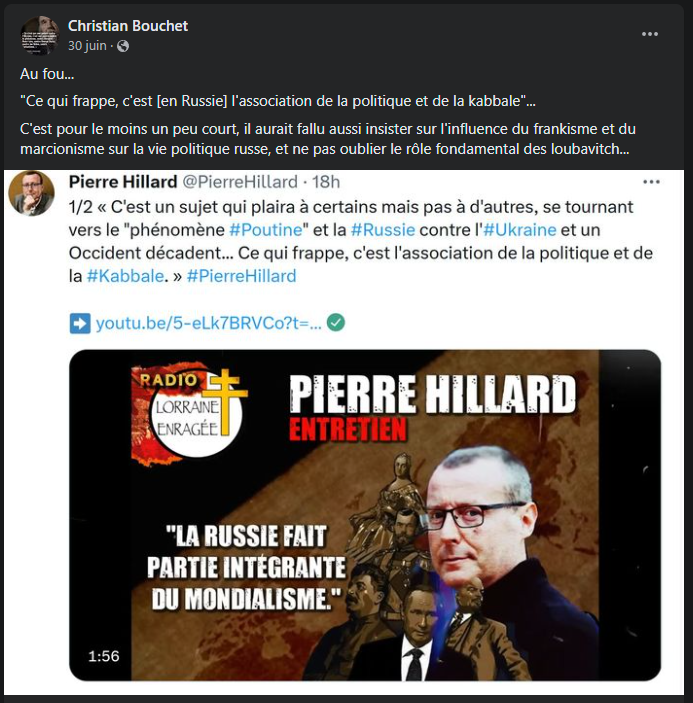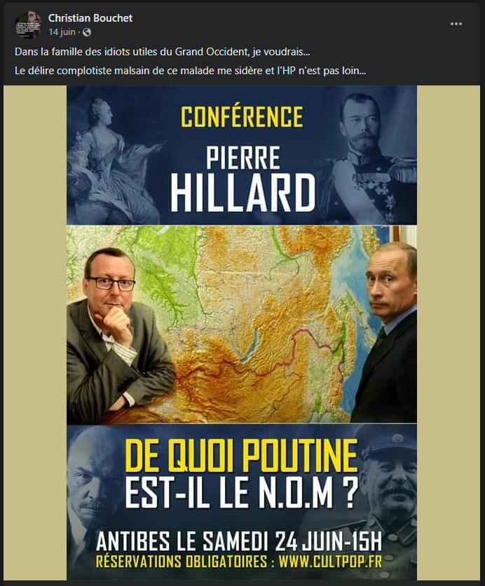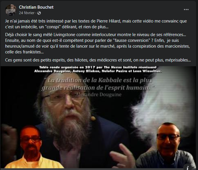 En effet, Christian Bouchet a publié une vingtaine de posts Facebook et tweets insultant ou psychatrisant « Pierre Hillard et ses épigones ». Florilège à faire défiler.
