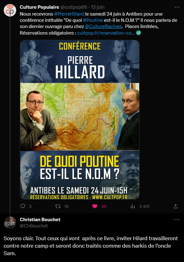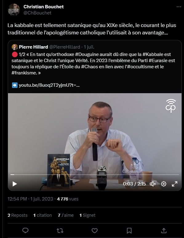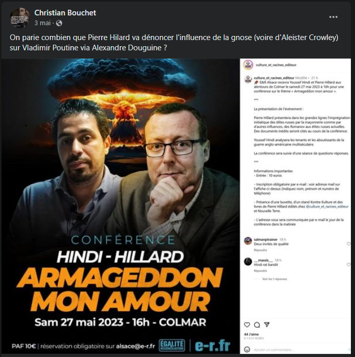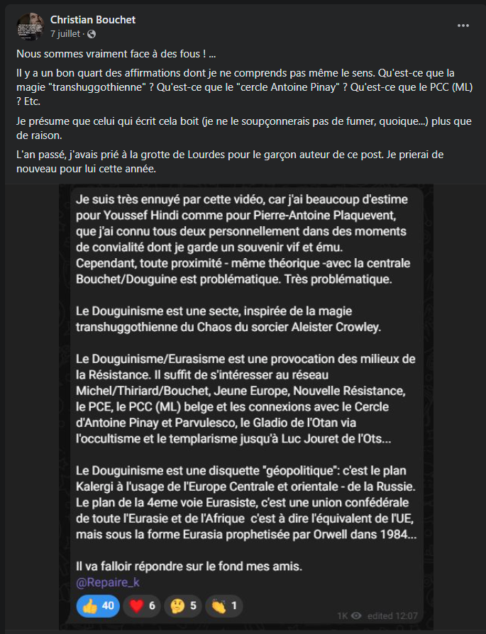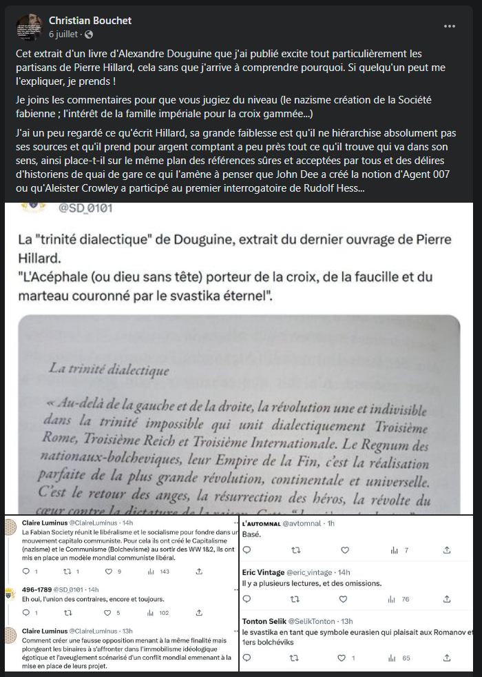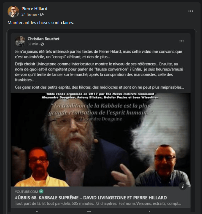 Tout a commencé fin février 2023, quelques semaines après la sortie d’Ûbris avec David Livingstone et Pierre Hillard évoquant entre autres les déclarations et attentes de Douguine. Bouchet démarrant les hostilités, Pierre avait simplement répondu en avoir pris note.