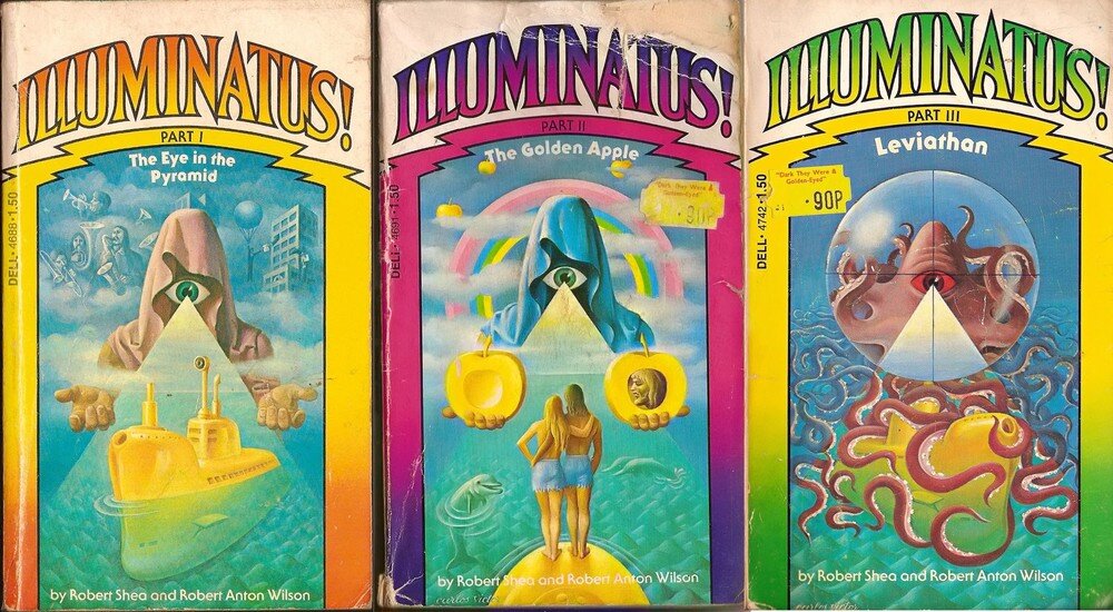 En 1969, Wilson et un autre rédacteur de Playboy, Robert Shea, inspirés par certaines des lettres que le magazine recevait souvent, décidèrent d’écrire un roman « à mi-chemin entre la satire et le mélodrame, et aussi en équilibre délicat entre « prouver » le bien-fondé des conspirations multiples et saper les « preuves » » 6. Le résultat fut Illuminatus! qui remporta le Prometheus Hall of Fame award for science-fiction en 1986. La trilogie comprend The Eye in the Pyramid, The Golden Apple et Leviathan, qui ont d’abord été publiés en trois volumes distincts à partir de septembre 1975. La trilogie est une aventure satirique, postmoderne, influencée par la science-fiction, qui mêle drogues, sexe, dieux lovecraftiens, kabbale et conspiration, en rapport avec la version des Illuminati proposée par les auteurs. Il est révélé à la fin de la trilogie que les discordiens, un groupe qui, malgré leur lutte éternelle contre les Illuminati, ont été infiltrés par un Illuminatus Primus, qui a joué les deux camps l’un contre l’autre afin de maintenir l’équilibre. Il est le représentant des « vrais » Illuminati, dont le but est de répandre l’idée que chacun est libre de faire ce qu’il veut à tout moment. Selon Brian Doherty dans Radicals for Capitalism, la trilogie Illuminatus! de Wilson est « le roman libertaire le plus influent depuis Atlas Shrugged, bien que son libertarisme ne soit pas toujours reconnu par les types de mouvements libertaires plus économistes » 7. En 1986, la trilogie Illuminatus! a remporté le Prometheus Hall of Fame Award, destiné à récompenser les classiques de la fiction libertaire.
