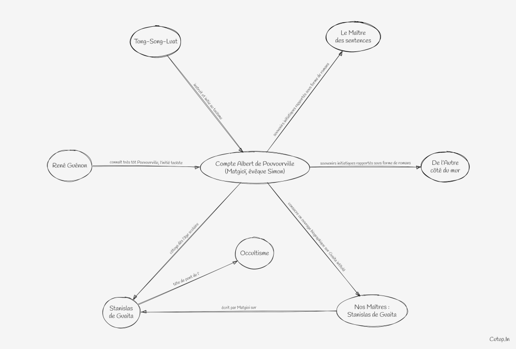Toujours par l’entremise des milieux maçon­nico-occultistes, Guénon connaît très tôt Pouvourville, initié taoïste plus connu sous le nom de Matgioï. Originaire de Nancy, Eugène-Albert-Puyou comte de Pouvourville côtoya dès l’âge scolaire celui qui allait devenir une tête de pont du mouvement occultiste, auquel il consacrera d’ailleurs un ouvrage biographique, Nos Maîtres : Stanislas de Guaita (1909). Devenu officier de cavalerie, il est affecté au Tonkin — comme déjà l’initié taoïste Philastre — où il ne tarde pas à porter un intérêt sérieux à la langue, aux idées et aux gens du pays. Ce qui l’amène à être considéré comme une sorte d’interprète officiel des lettres annamites auprès des autorités françaises. Ainsi, il fait la connaissance d’un sage thaumaturge, le Tong-Song-Luat qui occupe un haut rang « dans le Thien dianhien et dans le Bachlien, les deux Sociétés secrètes majeures de la Race Jaune » 26. Ce dernier l’instruit et l’initie au taoïsme sous le nom de Matgioï qui signifie « Œil du jour ». Au dire de J.-P. Laurant, cet ésotérisme extrême-oriental amena notre nouvel initié à comprendre « l’œuvre coloniale comme un échange entre le progrès matériel et scientifique apporté par l’Occident et la dimension métaphysique restituée à notre civilisation par l’Orient » 27. Ses souvenirs initiatiques sont rapportés sous forme de romans : De l’Autre Côté du Mur (1897) et Le Maître des Sentences (1899).