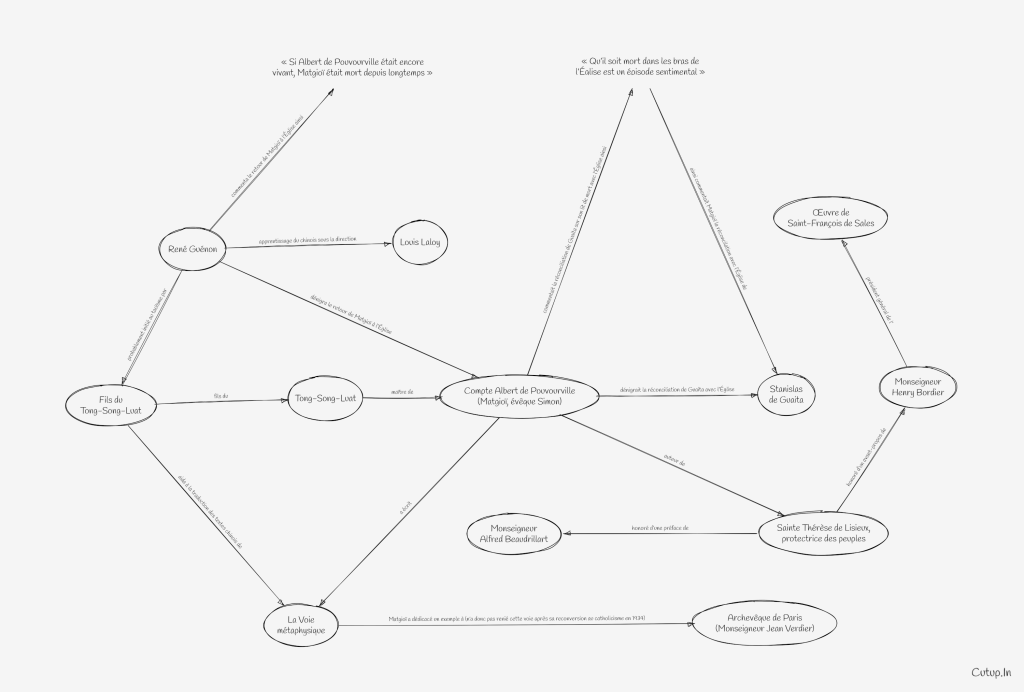 Par la suite, Guénon et Matgioï continueront à nourrir des liens et à se rencontrer, assez souvent chez Gary Lacroze, jusqu’au départ de notre auteur pour Le Caire en 1930. — Quel­ques années plus tard, on assistera à un véritable coup de théâtre avec la publication, sous la plume de Matgioï, d’une Sainte Thérèse de Lisieux, protectrice des peuples (1934) honoré d’une préface de Mgr Beaudrillart et d’un avant-propos du président général de l’Œuvre de Saint-François de Sales, Mgr Henry. Cette apologie de la « petite voie » après laquelle soupire la péninsule de l’Asie … sera tôt suivie d’une réédition de La Voie métaphysique avec un exemplaire dédicacé à l’archevêque de Paris.