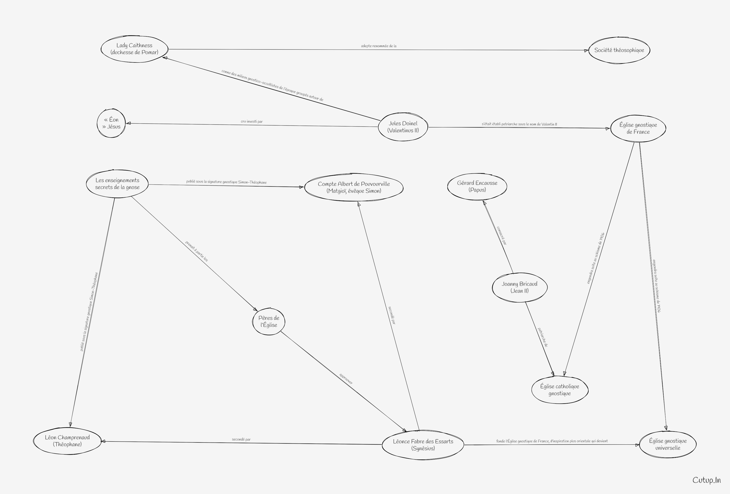 En 1890, après s’être cru investi par l’« éon » Jésus, Jules Doinel, bien connu des milieux gnostico-occultistes de l’époque groupés autour d’une adepte renommée de la Société théosophique, Lady Caithness, duchesse de Pomar, avait pris l’initiative de réanimer le mouvement gnostique. Marqué du sceau épiscopal 38 d’une part par un évêque régulier de l’Église catholique d’Utrecht et, d’autre part, par trois évêques cathares, et archiviste du Loiret, membre du Conseil de l’ordre du Grand Orient de France « que possédait avant tout une haine solide du catholicisme » 39, s’était établi patriarche de l’Église gnostique sous le nom de Valentin II. Désireux de restituer l’antique gnose et de voir resurgir un groupement de « Parfaits », il consacra à son tour un certain nombre d’évêques issus de son proche entourage, tels Papus, Sédir, Barlet, Jounet etc. Parmi eux, figurait Léonce Fabre des Essarts, historien de l’ésotérisme et poète symboliste, sacré évêque sous le nom de Synésius et qui succéda à Doinel à la tête du mouvement en 1902.