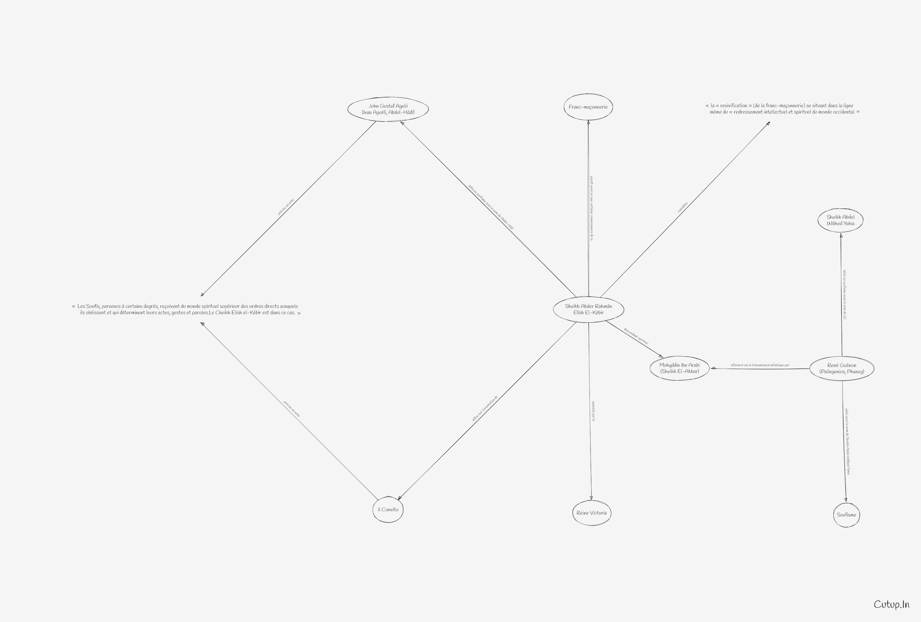 Compte tenu que Mohyddin Ibn Arabi est considéré comme le grand génie ; le doctor maximus du soufisme, en tant qu’il a réussi une des synthèses philosophico-religieuses les plus fortes de l’humanité, comparable à celles de Platon, de Plotin 60 et de certains védântistes — synthèse inspirée, par ailleurs, d’une mystique, d’une métaphysique, d’une gnose « universaliste » 61 qui se veut le cœur, la transcendance et la transparence de toutes les religions, voilées quant à l’essentiel par leurs points de vue respectifs — il apparaît que par la transmission « initiatique » due au Sheikh Elîsh El-Kébir, l’influence de Mohyddin Ibn Arabi allait se révéler de poids — sinon déterminante — sur René Guénon 62, initié au soufisme en 1912 sous le nom de Sheikh Abdel Wâhed Yahia : le « Serviteur de l’Unique, Jean ».