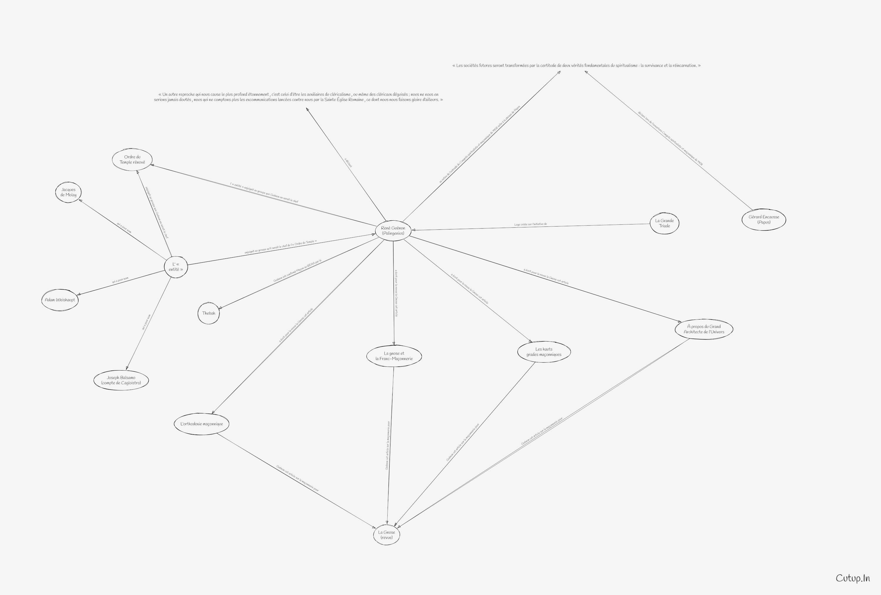 « Bien que Guénon se soit surtout consacré à l’exposition des doctrines orientales, il a souvent, dans ses articles et dans ses livres, remis en lumière, voire même expliqué pour la première fois, les principaux symboles maçonniques. » Hutin, S., Les francs-maçons, p. 177.